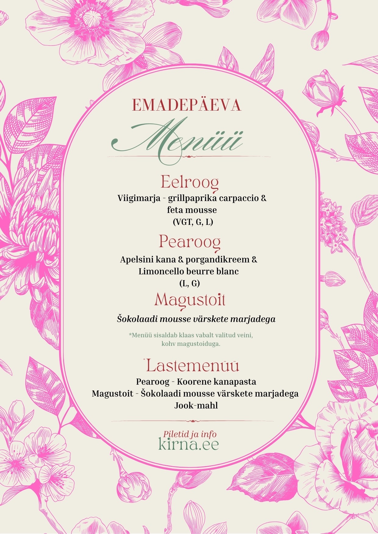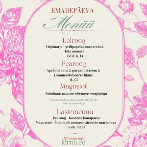 Tulbiaeg Kirnas on tavapäraselt vaba kulgemise aeg – laudu ei broneerita ja igaüks leiab oma rütmi. Emadepäeval teeme aga erandi. Tulles vastu soovile istuda terve perega ühe laua taga, oleme loonud sel aastal eksklusiivse võimaluse nautida pidulikku lõunasööki kaetud lauas, keset õitsvat aeda.
